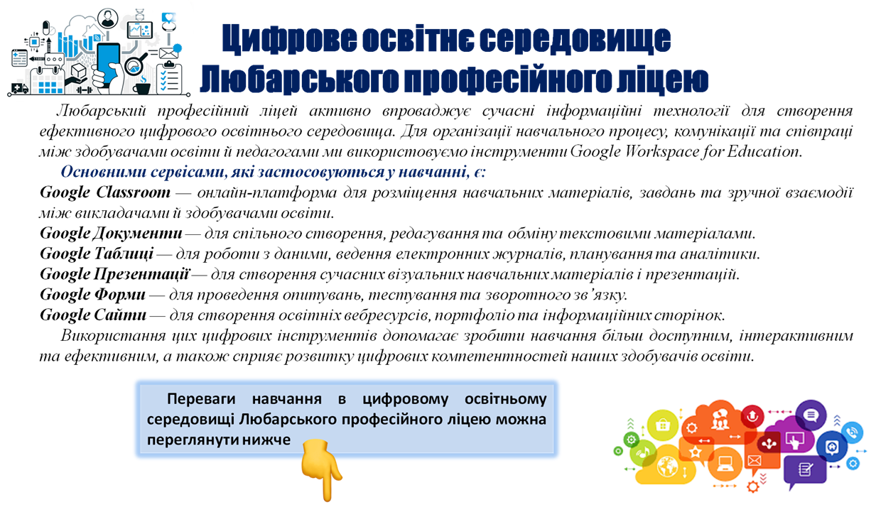 Проводити уроки віддалено, не бачити учнів, не мати можливостей пояснити особисто й допомогти в момент виникнення проблеми — педагоги не могли й уявити таких ситуацій у своїй роботі. Але пандемія, війна в Україні внесли несподівані корективи і змусили всіх терміново опановувати цифрові інструменти й нові педагогічні підходи та методики. Вимушене дистанційне навчання стало викликом для всіх учасників освітнього процесу: педагогів, учнів та батьків. Організувати якісне навчання з використанням цифрових технологій, надихати й мотивувати учнів, давати раду технічним проблемам виявилось зовсім непросто. Тому з цією метою у Любарському професійному ліцеї створена творча група педагогів, яка займається адмініструванням, забезпеченням функціонування та удосконалення системи управління дистанційним навчанням.
