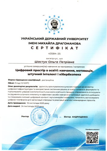 Викладач Шастун Ольга Петрівна успішно завершила дистанційну програму підвищення кваліфікації від Українського державного університету імені Михайла Драгоманова. Навчання проводилося за актуальною програмою «Цифровий простір в освіті: навчання, мотивація, штучний інтелект і кібербезпека». Сертифікат № 43584-25 підтверджує оволодіння сучасними цифровими інструментами для трансформації освітнього процесу. Вона набула компетентностей, необхідних для розвитку цифрової інфраструктури та використання системних освітніх рішень. Зокрема, підвищено спроможність інтегрувати штучний інтелект та ефективні засоби мотивації у навчальний процес. Шастун О. П. готова створювати якісний цифровий контент, мультимедійні матеріали та підтримувати цифрові компетентності студентів. Це важливий крок у реалізації сучасних освітніх проєктів та цифровій трансформації університету.
