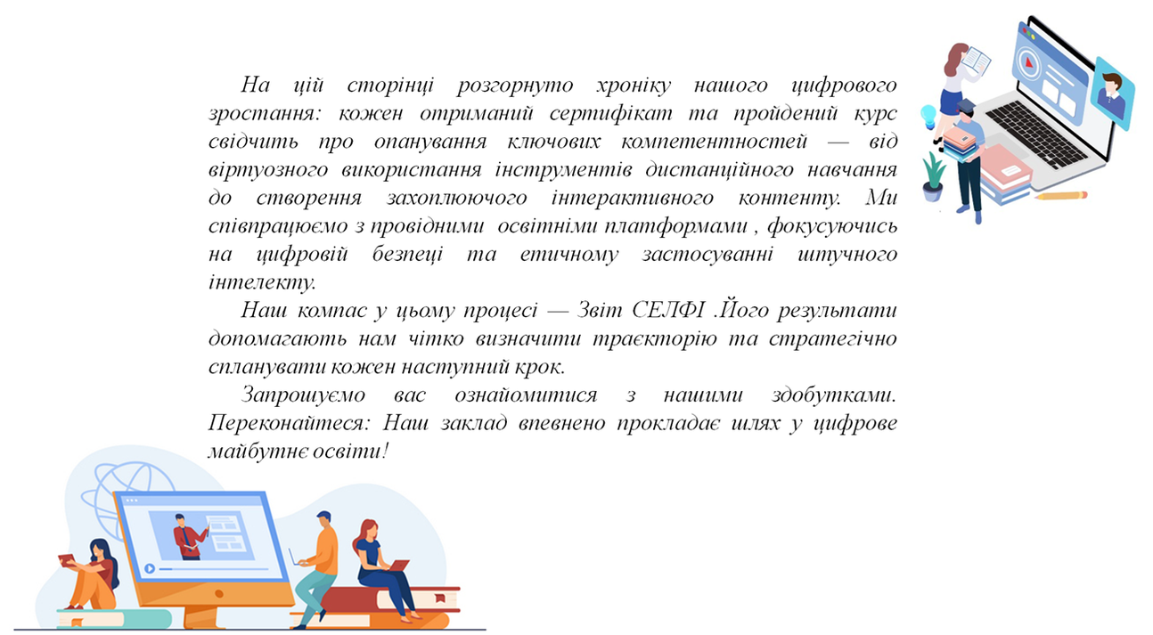 5 лютого 2025 року викладач історії та за сумісництвом заступник директора з виховної роботи Сікалюк Ріта Володимирівна взяла участь у вебінарі «СТВОРЕННЯ ЦИФРОВОГО освітнього контенту за допомогою мовних моделей ШІ». Цей захід проходив у межах освітньої програми підвищення кваліфікації «Професійний розвиток педагогічного (науково-педагогічного) працівника» та передбачав 3 години навчання (0,1 кредит ЄКТС).