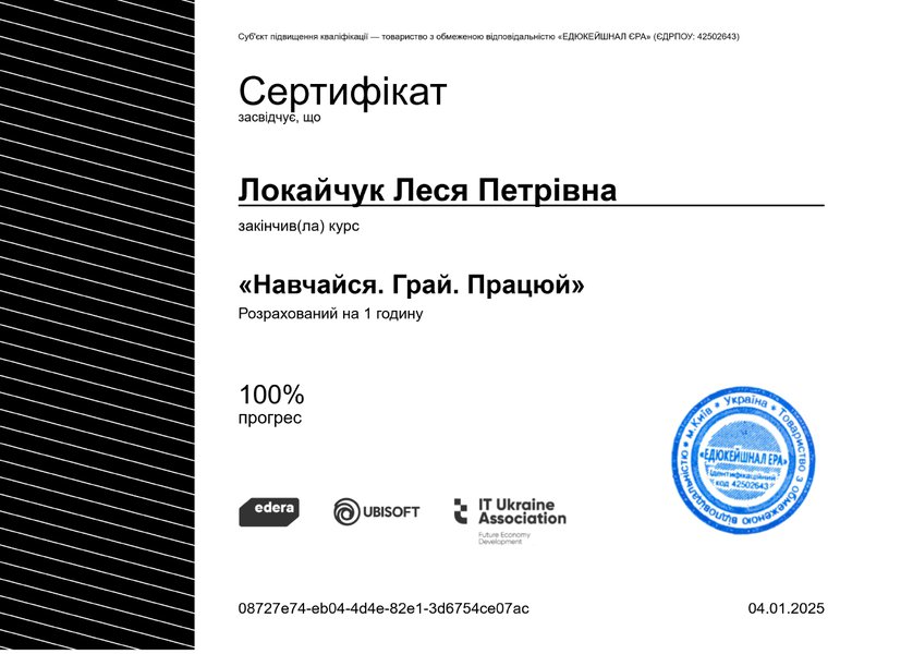 Локайчук Л.П. успішно завершила онлайн-курс «Навчайся. Грай. Працюй», створений у партнерстві студії онлайн-освіти EdEra. Він мав на меті розповісти школярам, батькам та вчителям, як перетворити інтерес до комп'ютерних ігор на потенційну кар'єру в одній із найперспективніших індустрій XXI століття. Слухачі курсу ознайомилися з п'ятьма основними напрямками роботи в розробці ігор: ігровим дизайном, програмуванням, тестуванням, артом та менеджментом.