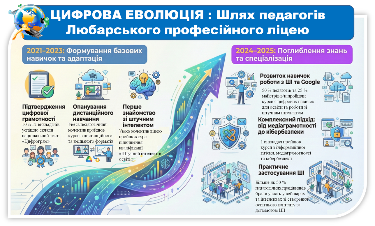 В умовах швидкого розвитку технологій, штучний інтелект стає невід'ємною частиною багатьох сфер життя, і освіта не є винятком. Тому керівництво Любарського професійного лицею, усвідомлюючи важливість підготовки педагогів до роботи в умовах цифрової трансформації, організувало курси підвищення кваліфікації, присвячені ШІ.