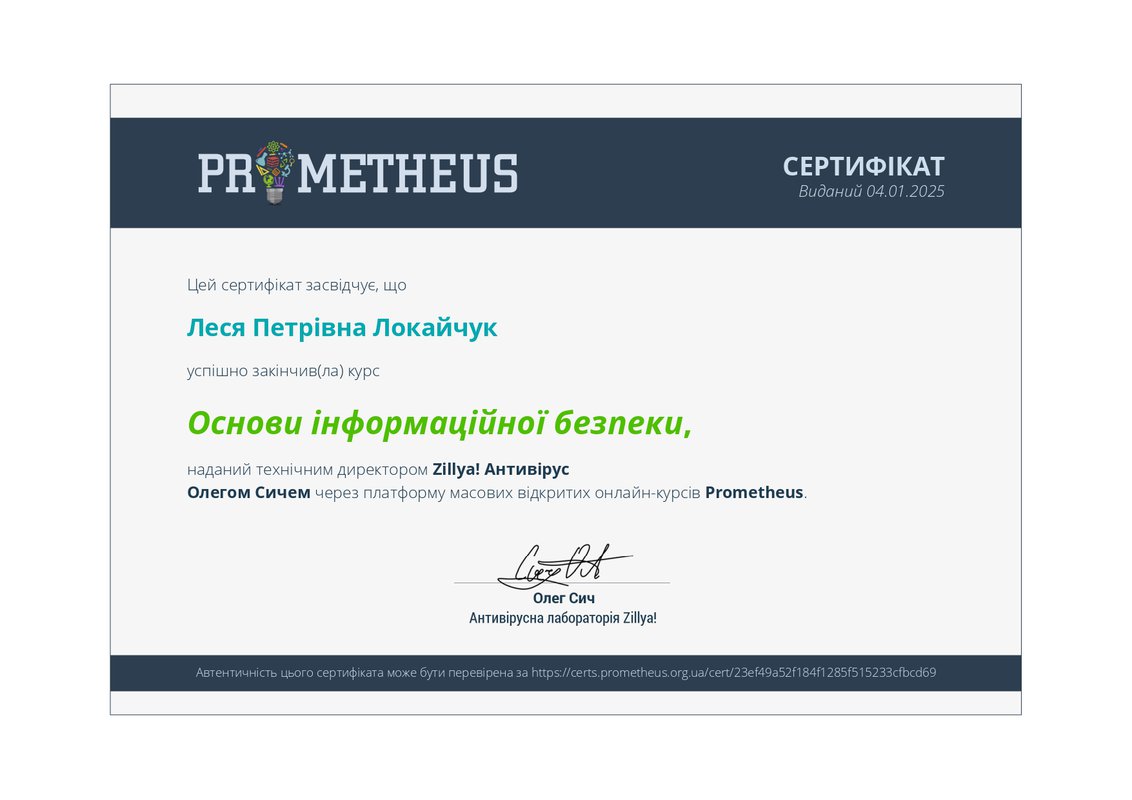 Локайчук Л.П. успішно завершила онлайн-курс «Основи інформаційної безпеки» на платформі масових відкритих онлайн-курсів Prometheus. Успішне завершення цього курсу свідчить про опанування ключових навичок для забезпечення безпеки даних та роботи в сучасному цифровому середовищі.
