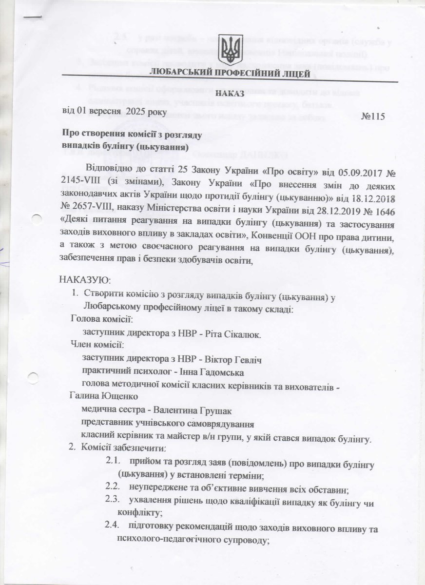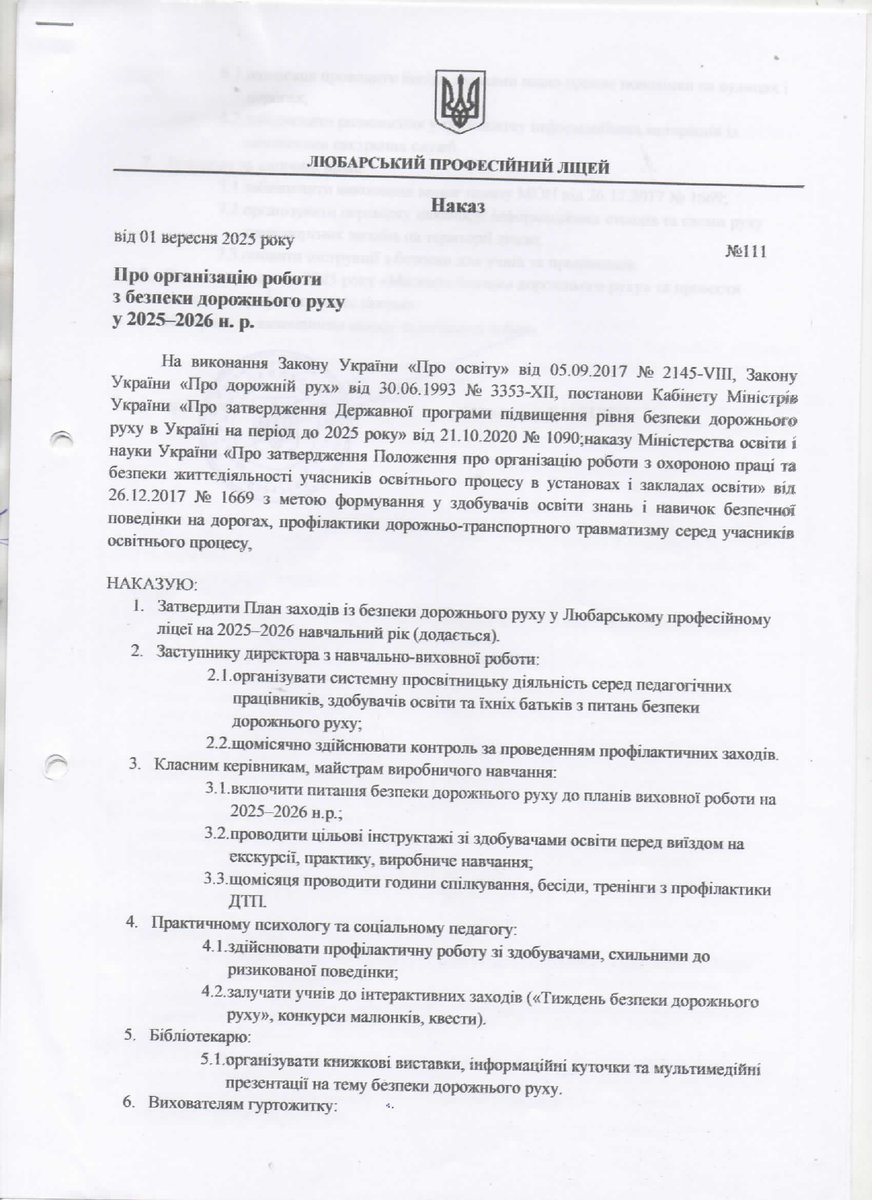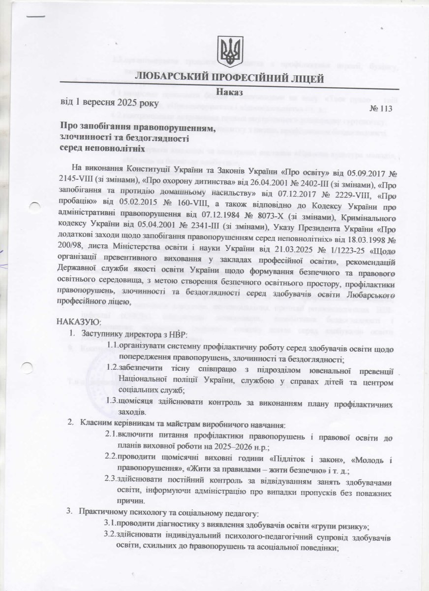 Відповідно до листа Управління Служби безпеки України в Житомирській області від 04.09.2024 року № 57/10509, у Любарському професійному ліцеї було проведено ряд виховних годин на тему протидії скоєнню терористичних проявів. Заходи охопили здобувачів освіти різних груп та курсів.