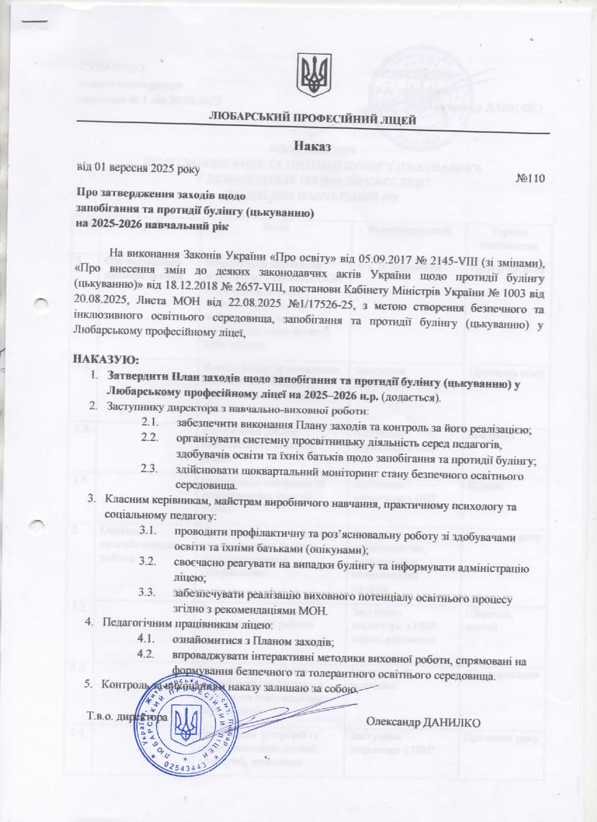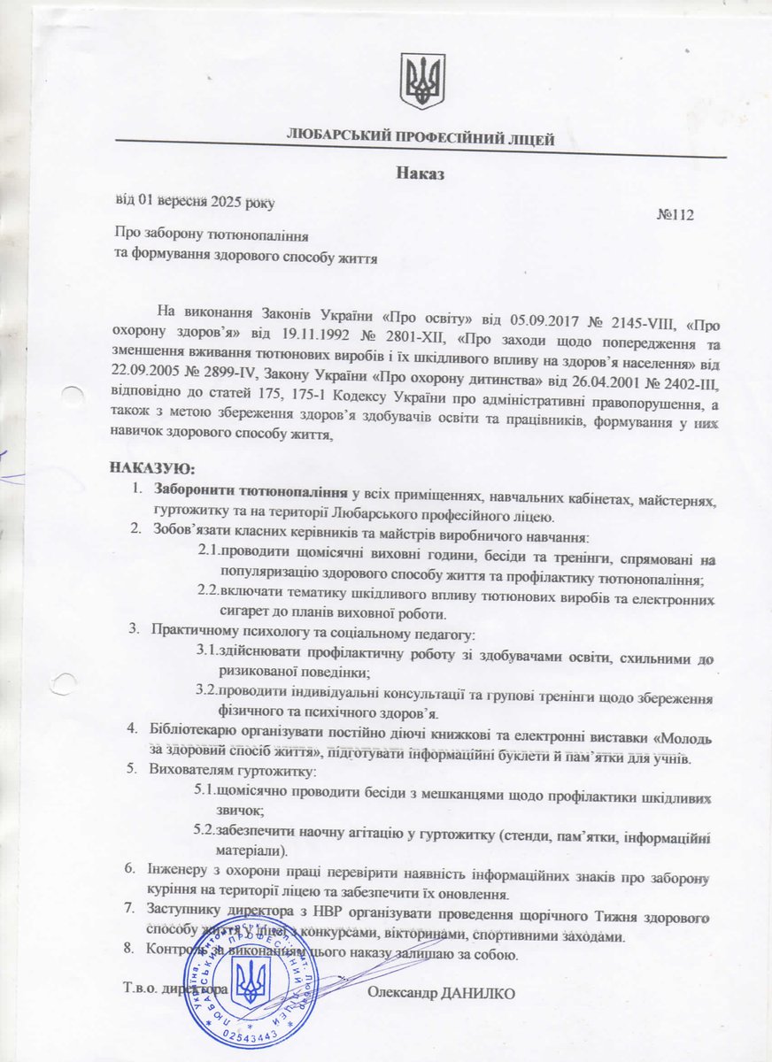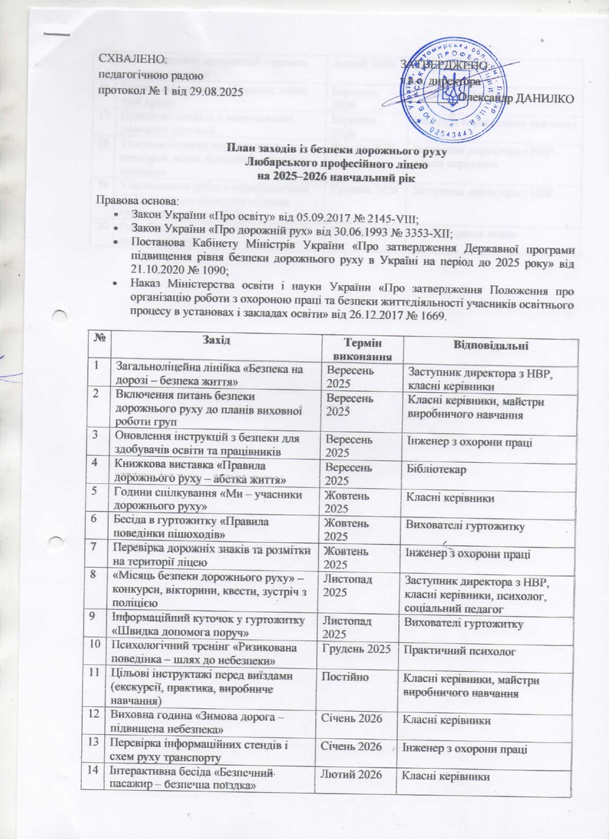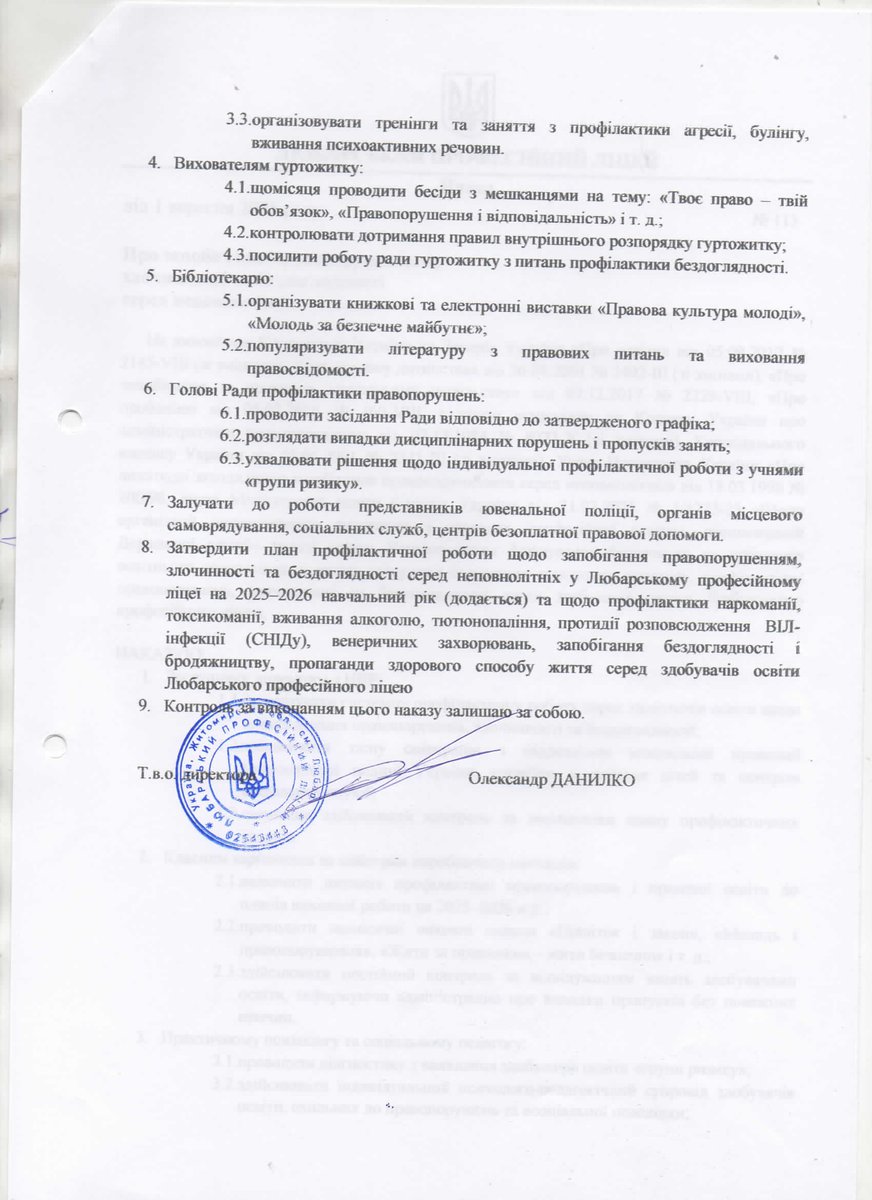 Відповідно до листа Управління Служби безпеки України в Житомирській області від 04.09.2024 року № 57/10509, у Любарському професійному ліцеї було проведено ряд виховних годин на тему протидії скоєнню терористичних проявів. Заходи охопили здобувачів освіти різних груп та курсів.